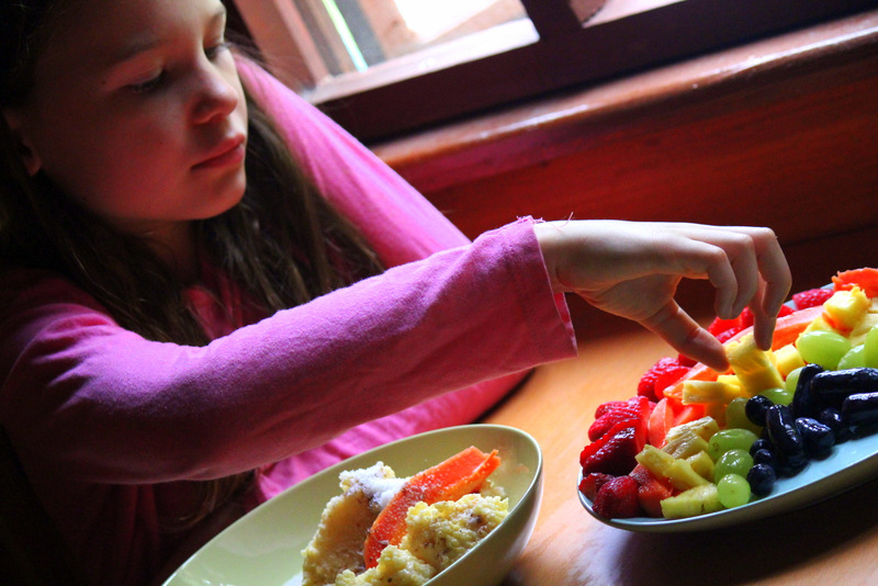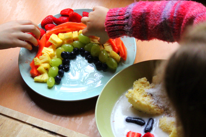 To continue the excitement of our Rainbow theme lesson, this morning for breakfast we made a rainbow fruit platter. (It was actually meant to be rainbow fruit kebabs, but alas, the kebab sticks went missing! I think it came out quite well though and the girls really enjoyed helping themselves to beautiful sweet colourful fruit and adding it in to their breakfast.)