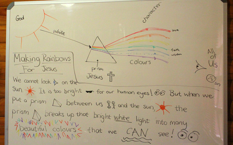 I drew a rough sketch on our whiteboard of how the prism forms a rainbow from white light, just to make sure they ‘got it’. I also wrote up a summary of what we learnt for them to copy into their workbooks.